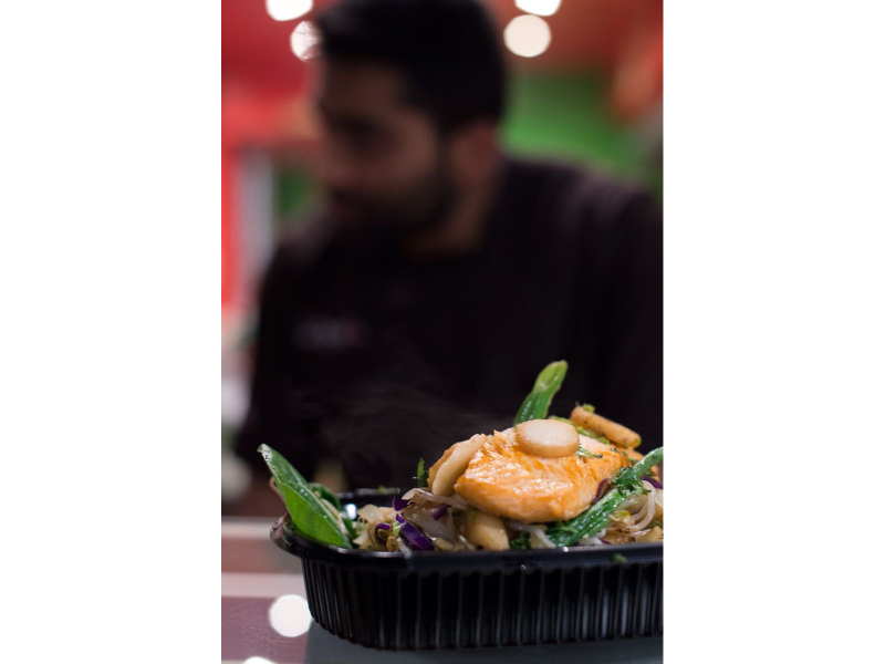 Pan seared in season vegetables w/ fillet of lean salmon steak and star anise glaze